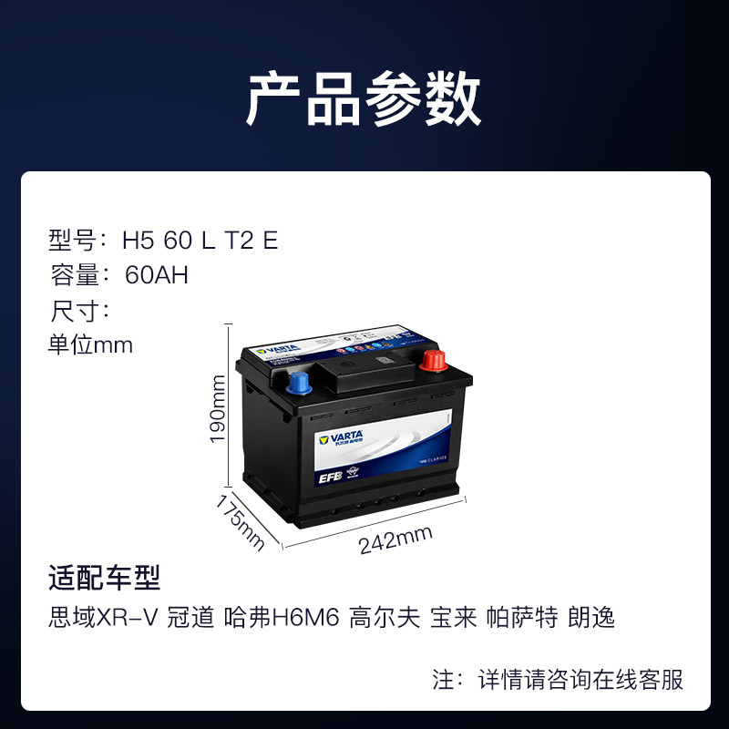 • 商品名称:瓦尔塔汽车电瓶蓄电池EFB 60ah启停电瓶XRV思域雅阁smart汽车电池(EFB系列丰田)